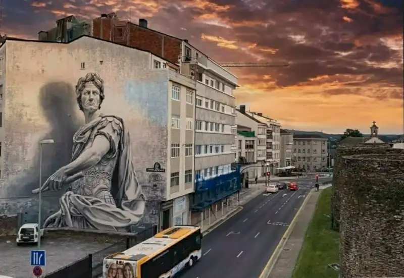 En el corazón del casco histórico de Lugo se encuentra la Ronda de la Muralla Romana, uno de los lugares más emblemáticos y visitados de la ciudad. Fue en este entorno que el artista español Diego As decide instalar su mural, «Julio César», que ha convertido esta ubicación en un verdadero hito del arte urbano gallego.