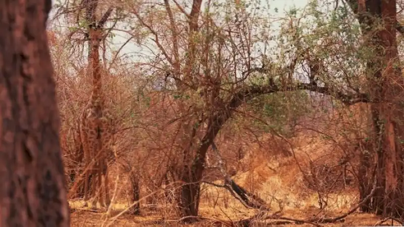 En una imagen tomada por un fotógrafo de vida salvaje, podemos ver a una jirafa acurrucada detrás de un tronco grueso, rodeada de hojas verdes y ramas espinosas. A primera vista, puede parecer que el tronco está vivo, y que la jirafa es simplemente una parte más del entorno. Sin embargo, al mirar atentamente, podemos ver que hay un par de ojos castaños que brillan con vida detrás del follaje. Es un ejemplo perfecto de cómo las jirafas han desarrollado el arte del camuflaje para sobrevivir en su entorno natural. Al igual que otros animales, las jirafas deben ser constantemente vigilantes y listas para huir o defenderse a cualquier momento, pero gracias a su capacidad para camuflarse, pueden disfrutar de una vida relativamente segura en el salvaje África.