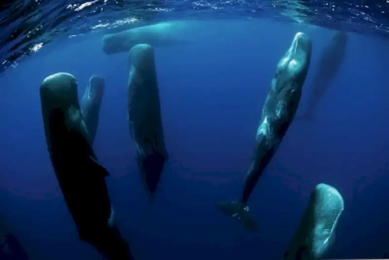 En un video hipnótico, los cachalotes pueden ser vistos durmiendo verticalmente en el agua, sufriendo una especie de trance que les permite sumergirse en sueños submarinos. La cámara muestra la tranquilidad con la que se desplazan a través del agua, sus movimientos lenta y controlados, como si estuvieran siguiendo un ritmo invisible. Es como si su cerebro les dictara el movimiento, como si estuvieran en estado de trance.