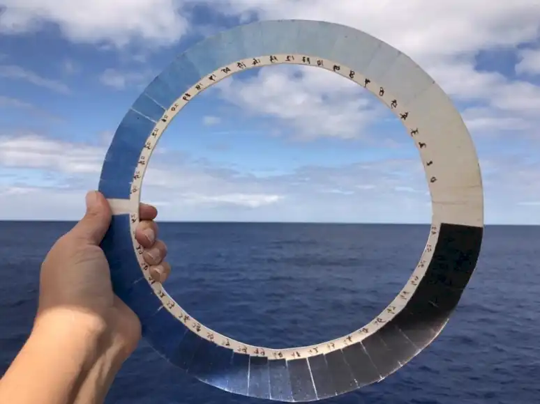 El cianómetro es un instrumento innovador que se basa en la percepción humana del color azul para medir su intensidad en el cielo. El dispositivo consta de 52 pedazos de papel teñidos con un pigmento llamado azul prusia, que van desde el blanco hasta el negro. Cada pedazo de papel tiene una graduación numérica que indica la cantidad de azul presente en ese tono específico. Cuando se coloca el cianómetro en posición horizontal, el observador puede ver el cielo y elegir el pedazo de papel que mejor se ajusta al color del azul que lo rodea. La elección del pedazo de papel corresponde a un número numérico que se registra en una tabla adjunta, permitiendo así medir la intensidad del azul del cielo.